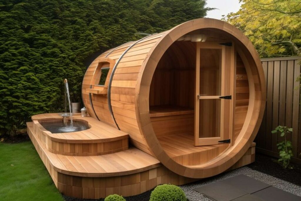2. Design und Bauweise: Überlegen Sie, welches Design am besten zu Ihrem Garten passt. Ein traditionelles Saunafass aus Holz kann einen rustikalen Charme verleihen, während ein modernes Saunahaus mit klaren Linien und großen Glasfronten einen zeitgenössischen Look bietet.